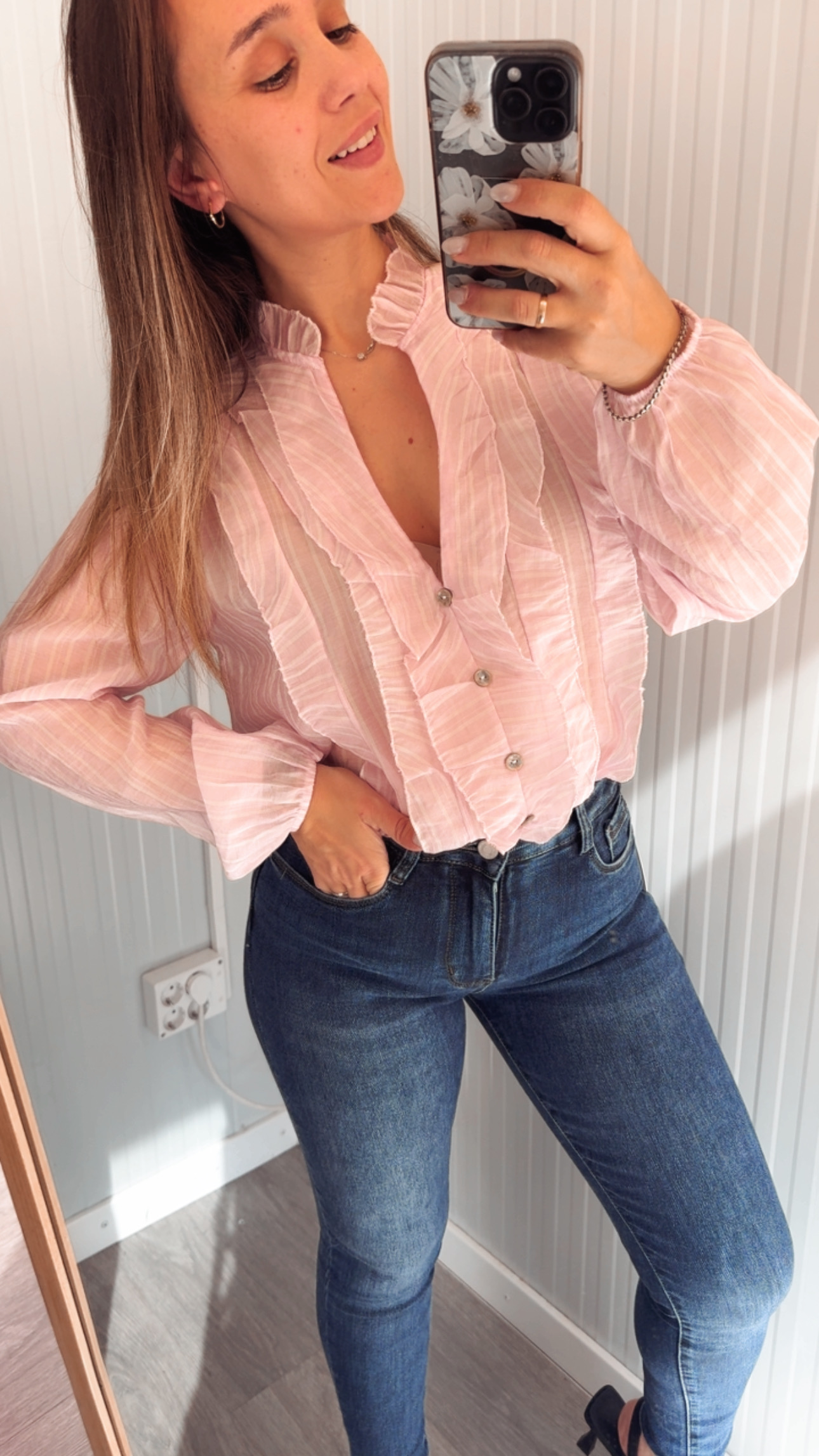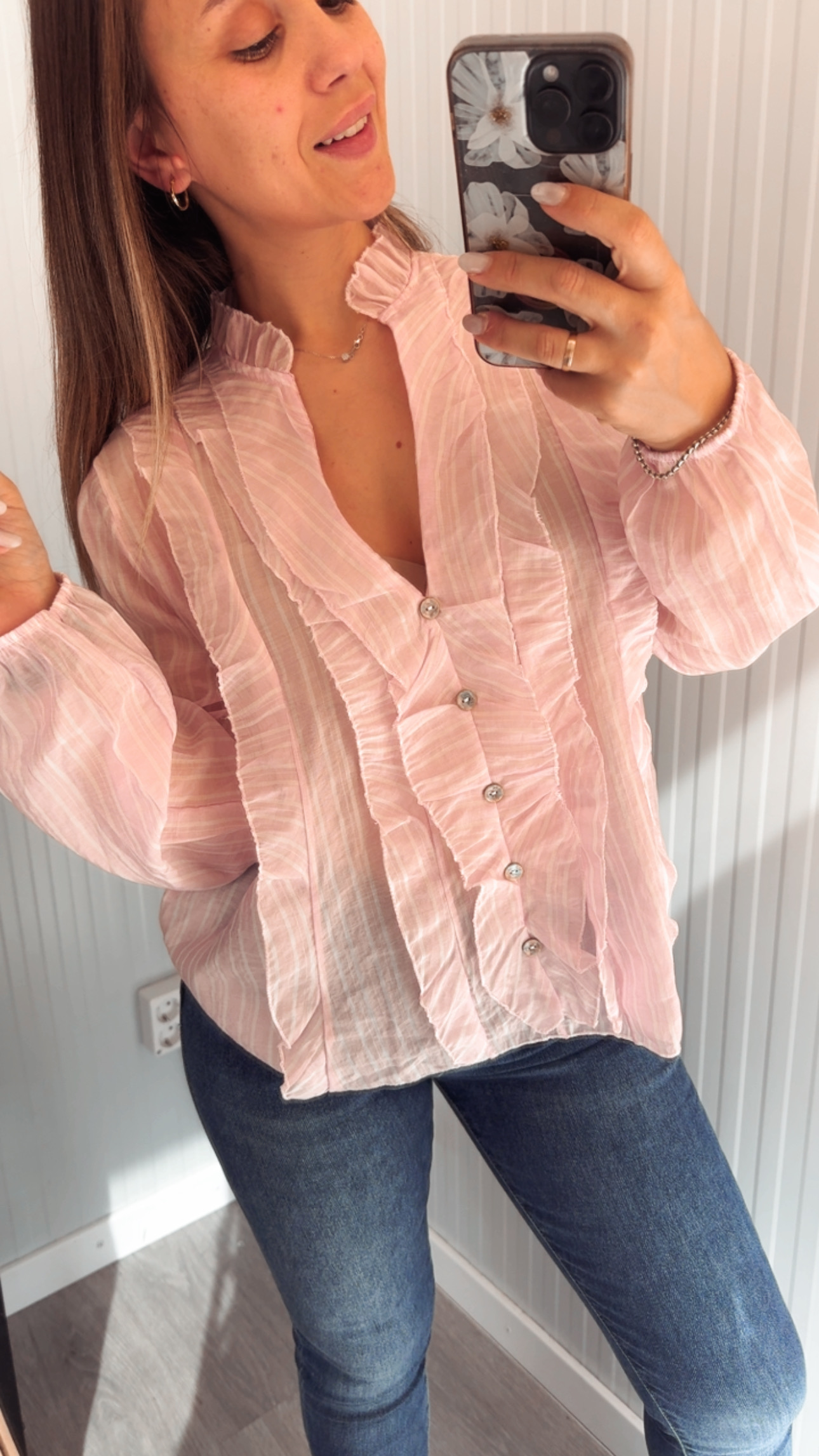 Camisa en rosa clarito con rayas en blanco. Talla única (hasta 44)